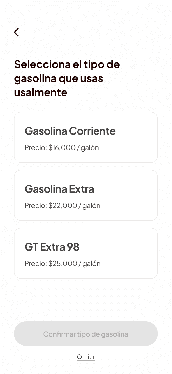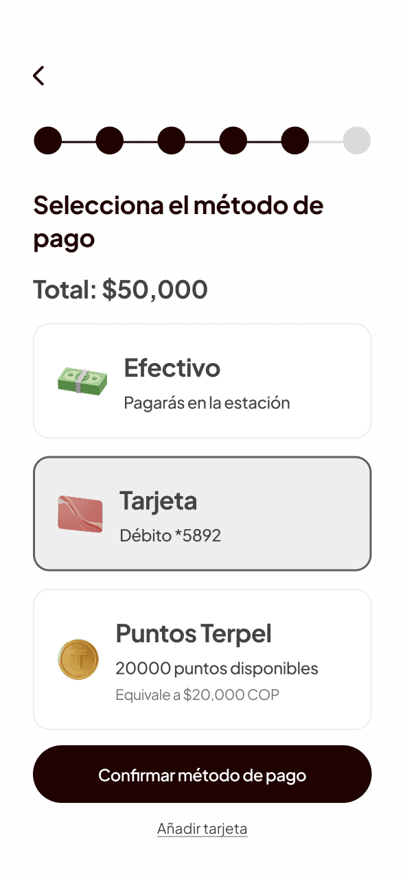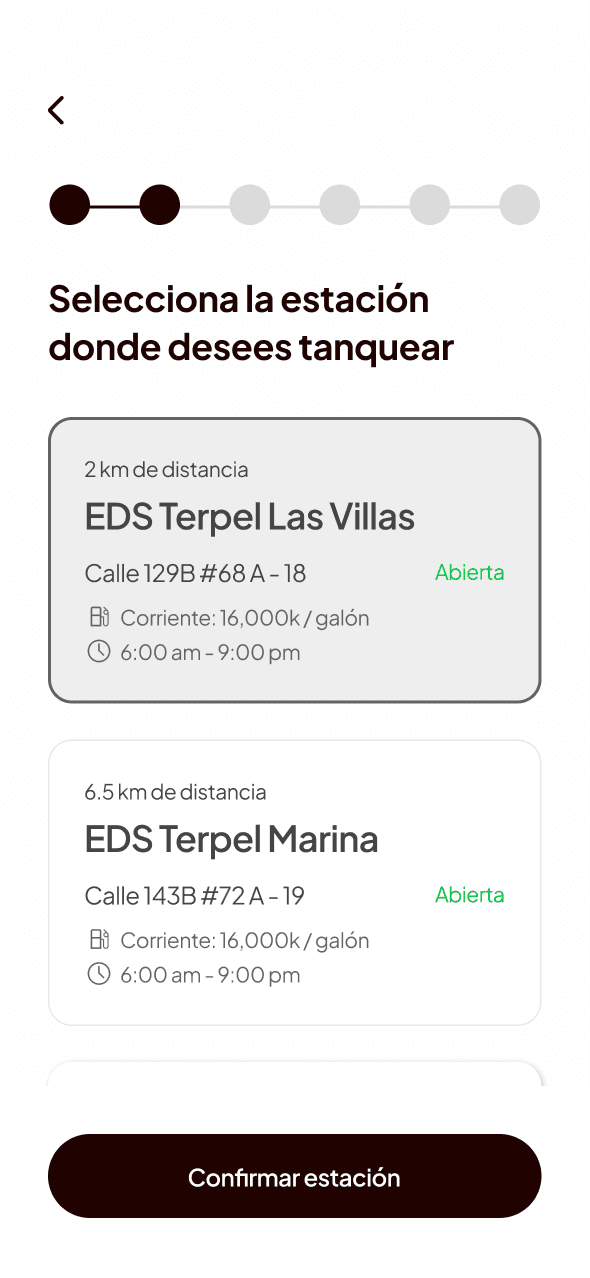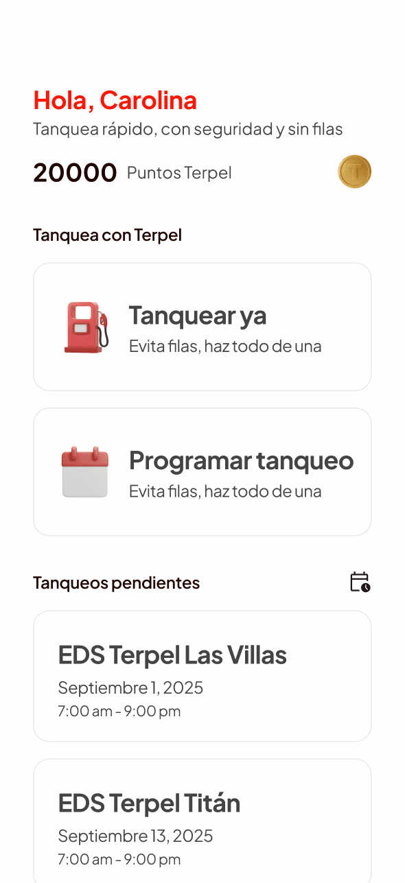 Mobile app interface design for Terpel, enabling fuel payments, visit scheduling, and a smoother everyday gas station experience for drivers.